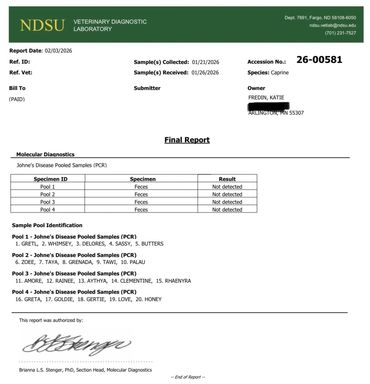The entire adult herd (year and older) was last tested in December 2022, all negative for CAE by the University of Minnesota, an accredited laboratory. All incoming goats are tested for CAE, CL & Johne’s and we test for CAE yearly after that. **Starting in 2024, CAE will continue yearly & we are doing Johne's PCR testing every 6 months.** No goat in my herd has ever had abscesses, the CL test is very unreliable.
